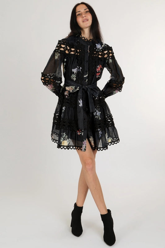 Floral Print Cutout Lace Detail A-Line Mini Dress