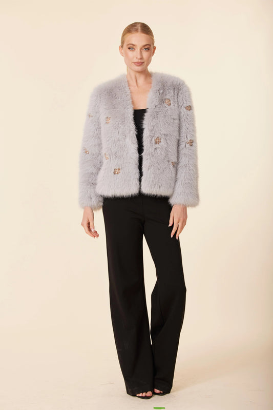 Embellished Rhinestone Flowers Faux Fur Jacket
