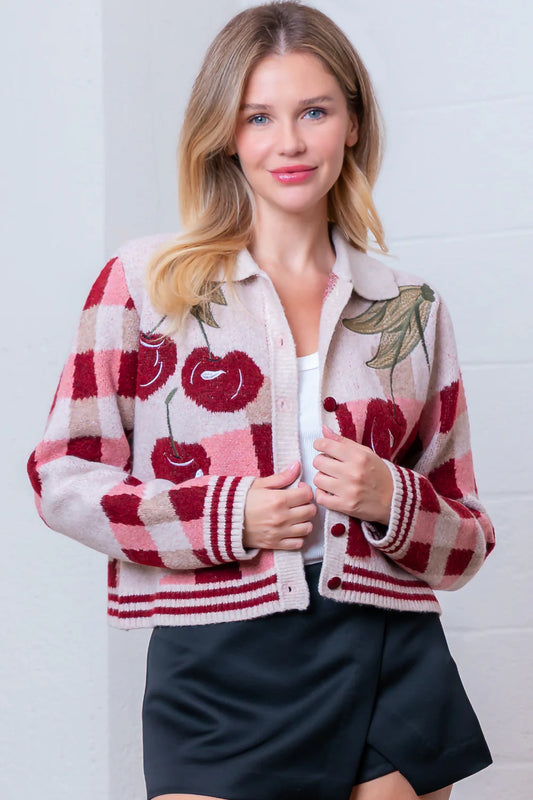 Cherry Scaloped Button Up Sweater Top
