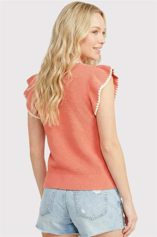 Blanket Stitch Ruffle Short Sleeve Top-Papaya