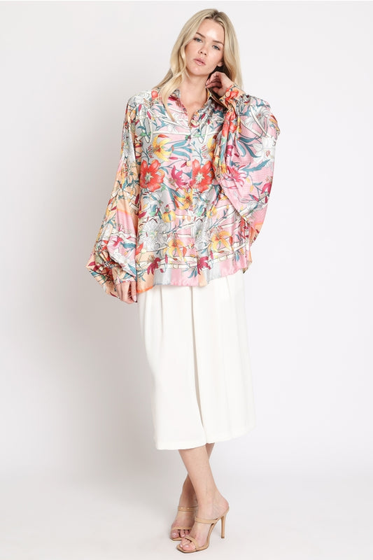 Modern Graphic Floral Printed Satin Blouse One Size