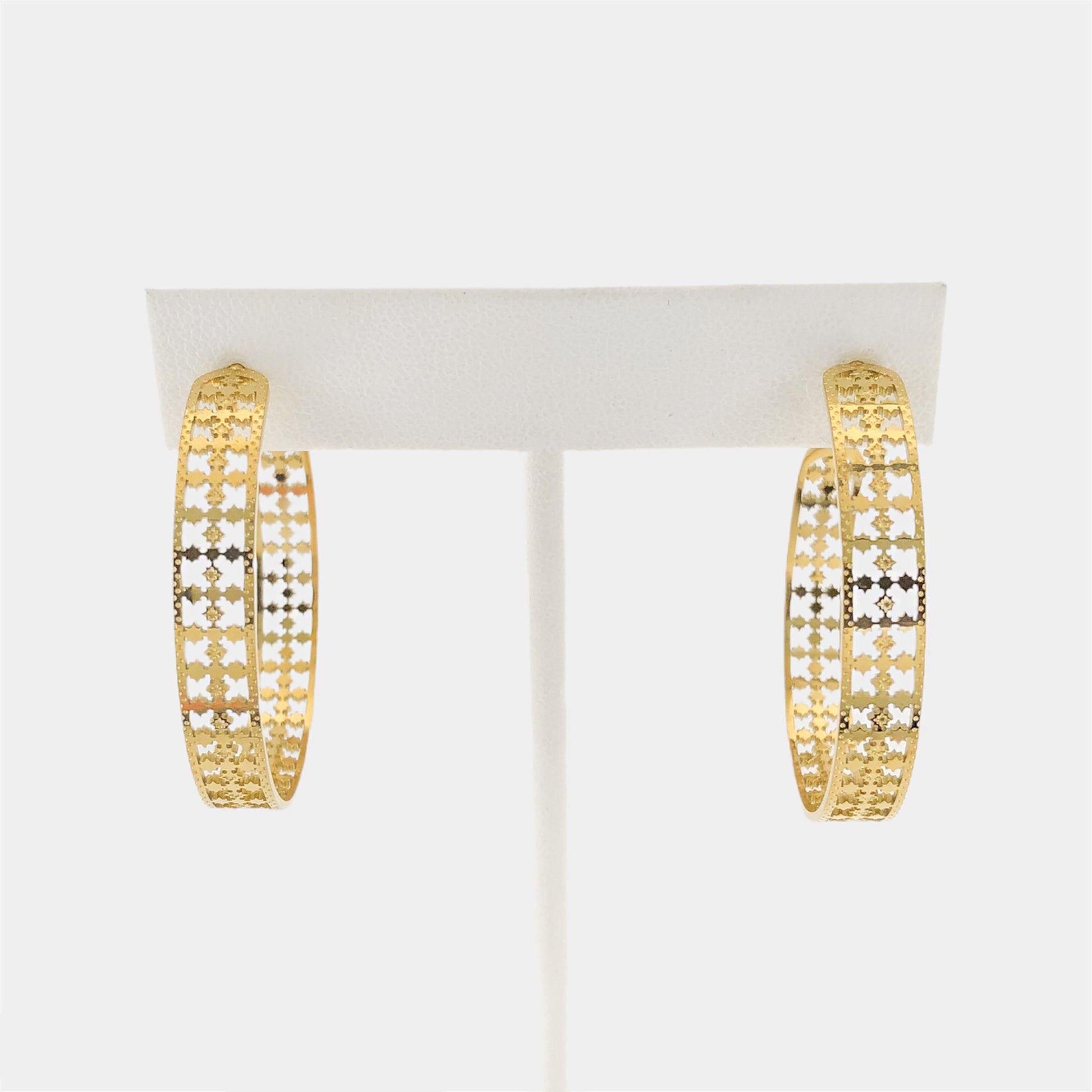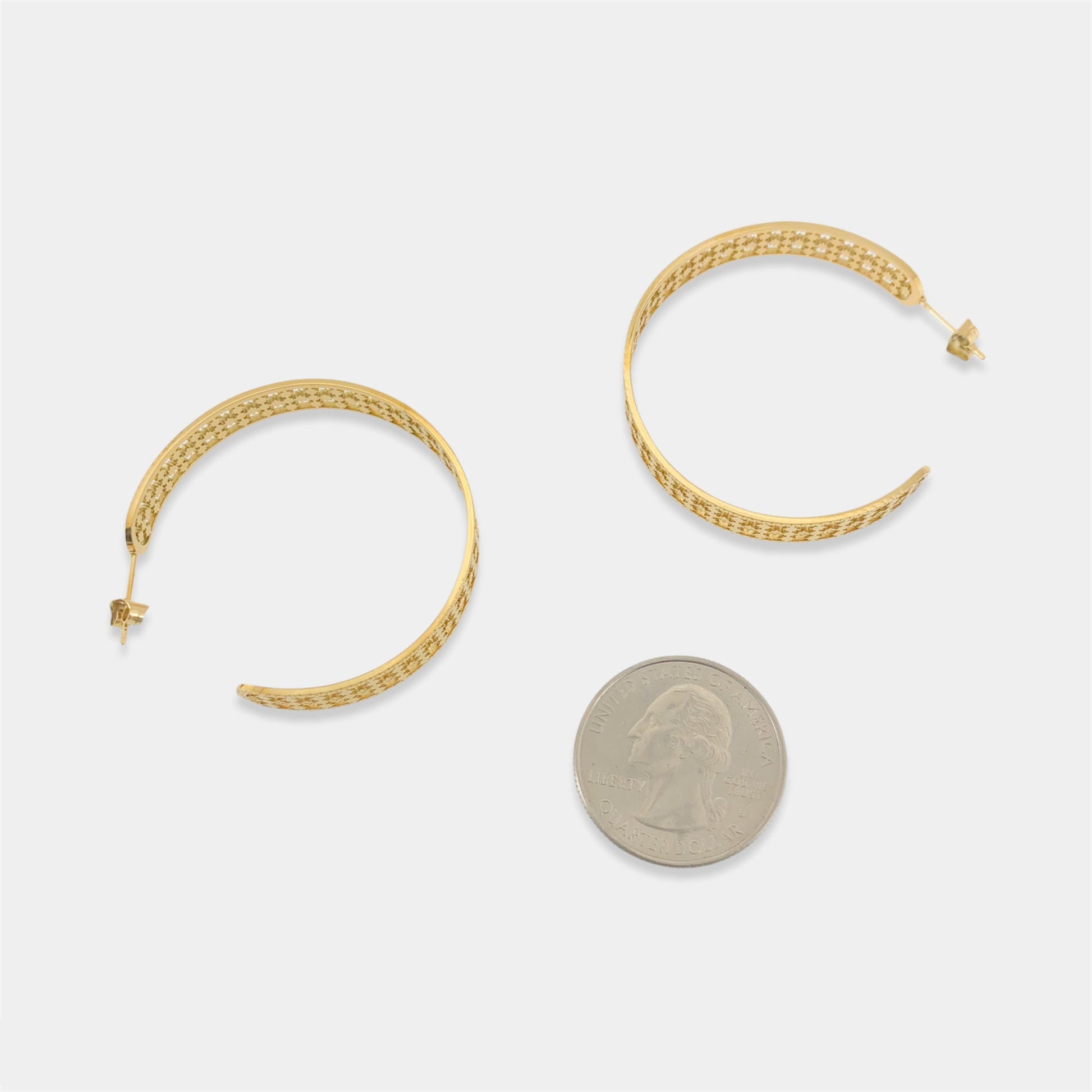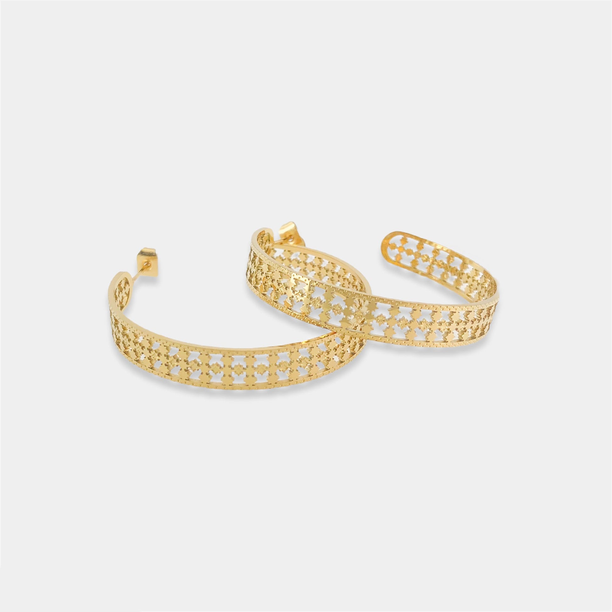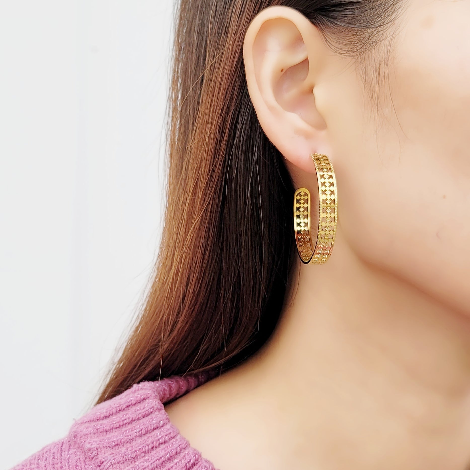 Stainless steel push back hoop earrings with starburst pattern and textured outline.