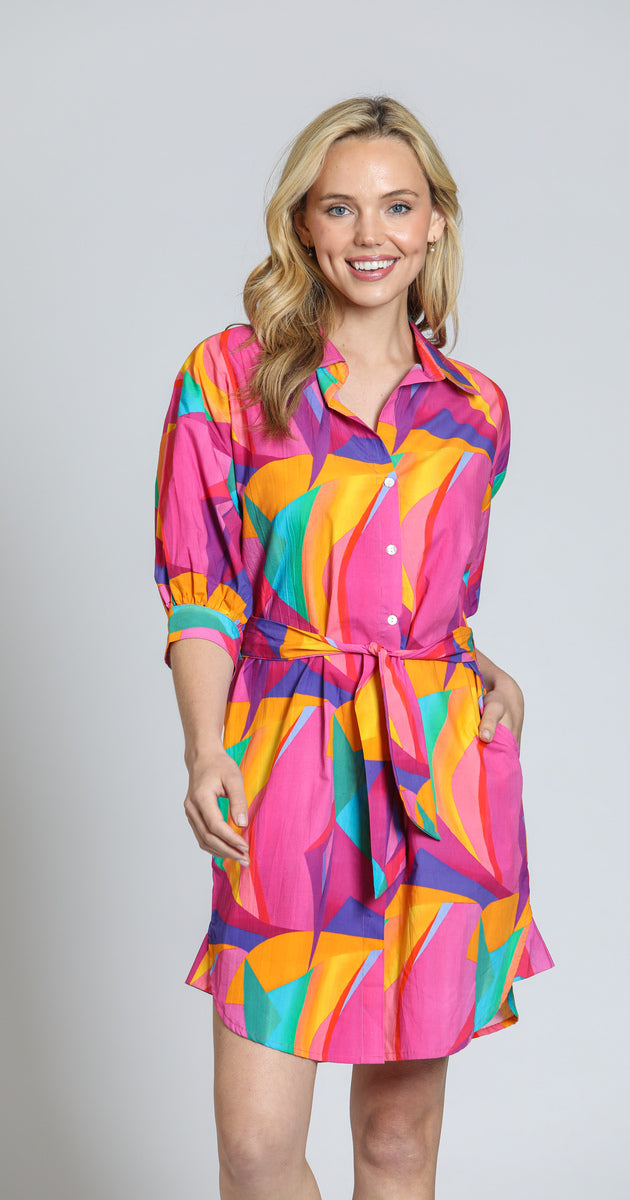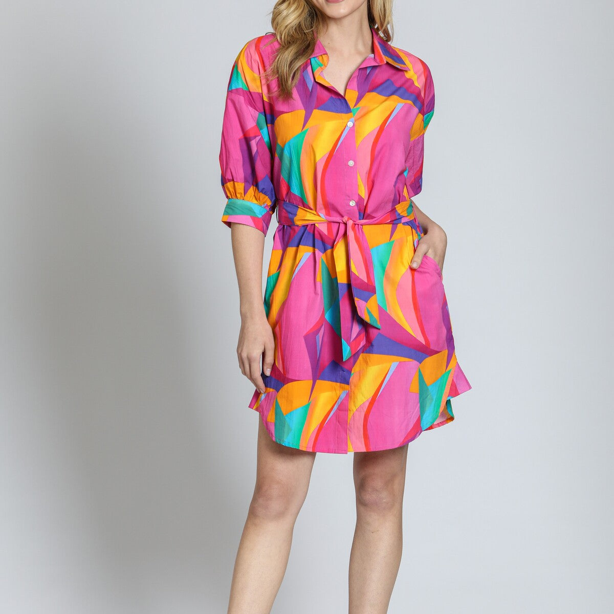 Belted Dress w Puff Sleeve Pink/Gr Multi