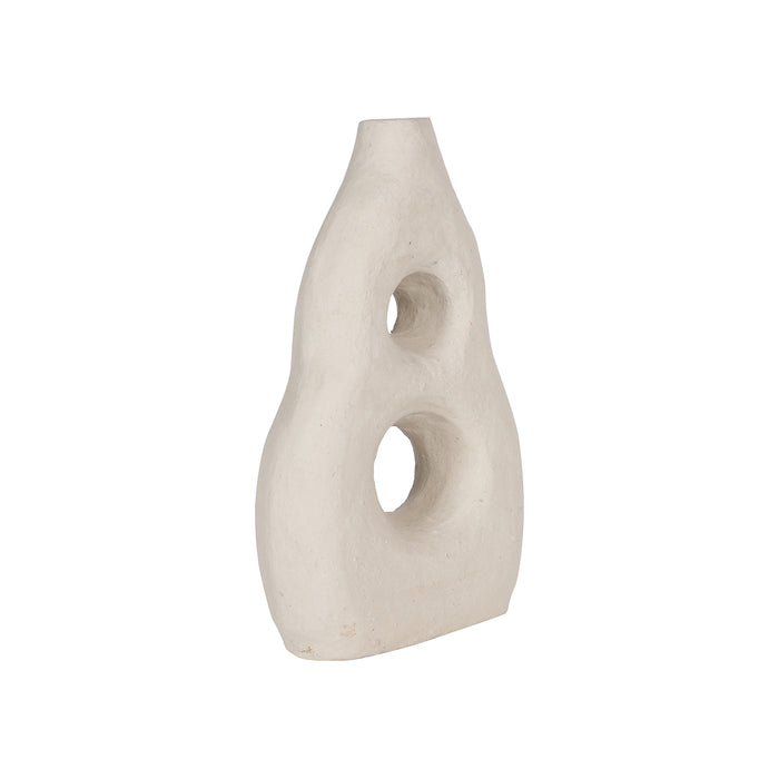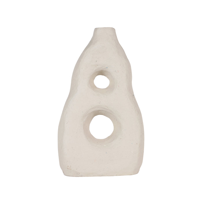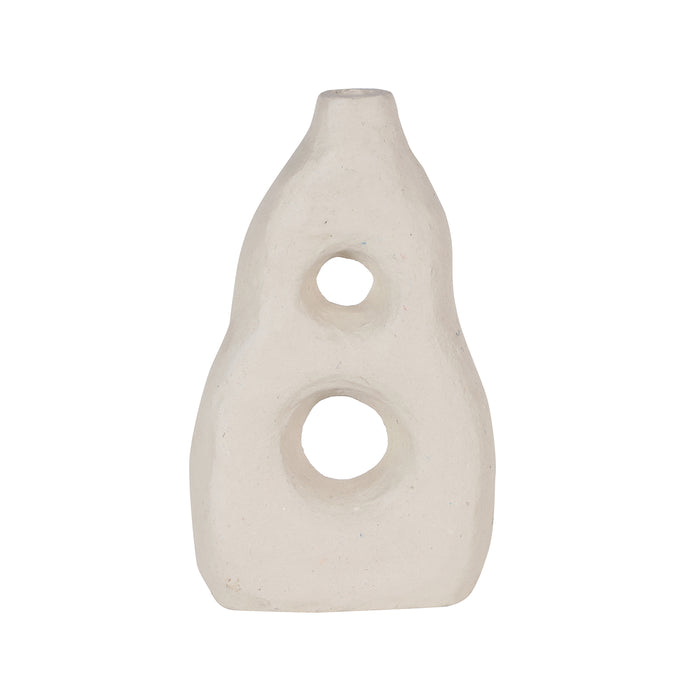 Crafted by artisans in India, the Tangier Paper Mâché Vessel is finished in a creamy white hue. The modern-looking Tangier Paper Mâché Vessel is an 8-shaped vase that retains the fibrous texture of its paper construction. Paper Mâché is an art form that began in China between 202 AD and 220 BC before gaining popularity in Western cultures. The size and shape of each Tangier Paper Mâché Vessel will vary slightly. It is not intended to hold water.