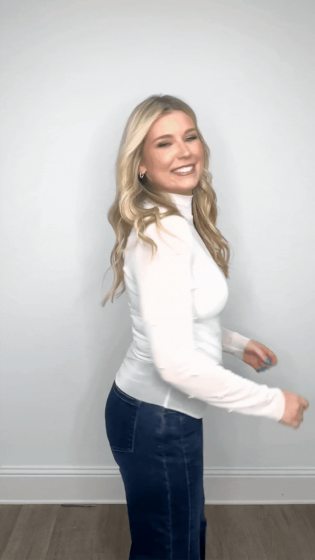 Pearl Detail Mesh Top Designed for a contemporary silhouette, this mesh top features a mock neck and high-stretch fabric for unrestricted movement. Pearl embellishments accent the sleeves, adding refined detail to an otherwise minimalist design. The unlined construction creates a modern, breathable aesthetic. Note: This style runs large—consider sizing down for an optimal fit. Model Taylor (5'7", size 8) wears a Small.