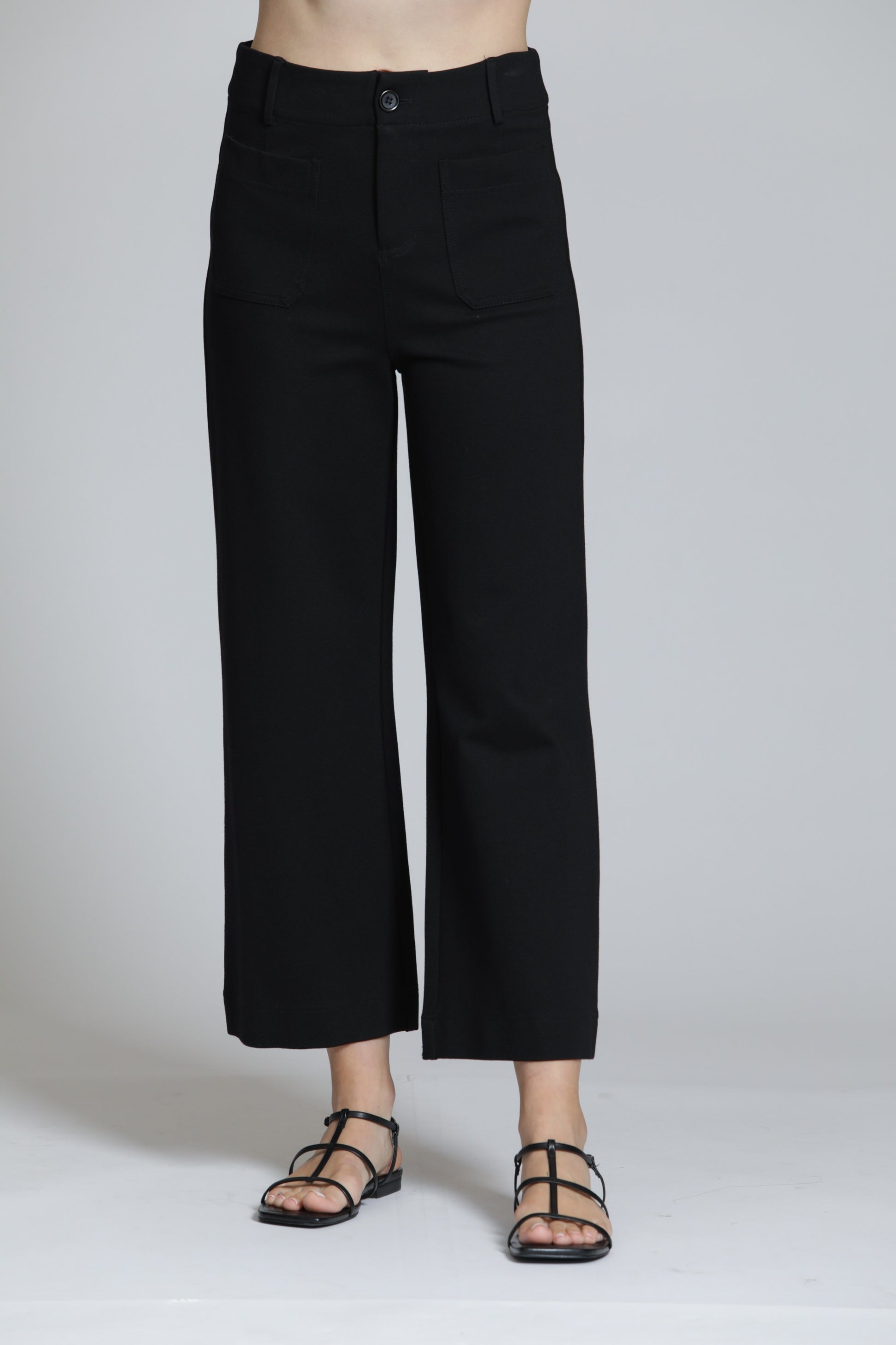 The Ponte Cropped Wide Leg Pant boasts a mix of 68% viscose, 28% polyester, and 4% spandex for the right fit. This wide-leg, patch-pocket creation can be fashioned stylishly and utility, so it is a must-have in every modern-day closet. Wear it with tight-fitted crop tops with a jacket.