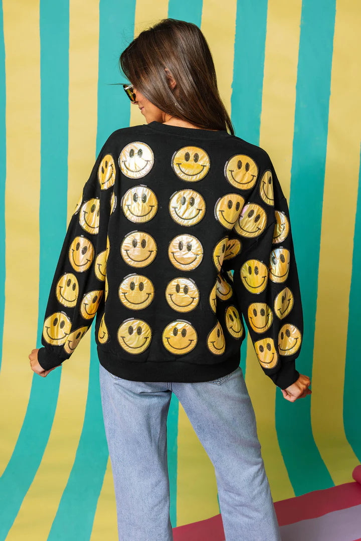 Elevate your style and mood with our Black & Yellow Scattered Smiley Face Sweatshirt. The oversized fit offers ultimate comfort, and the scattered metallic design adds a touch of fun to your look. Perfect for turning an ordinary day into an extraordinary one.